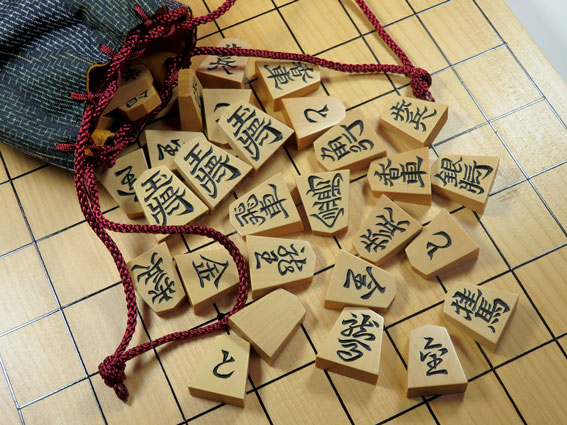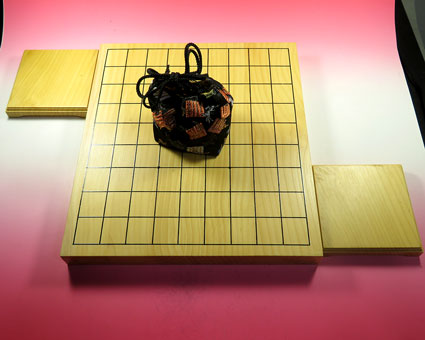 上記の駒が収めれている駒袋・盤・駒台のミニセット。 |