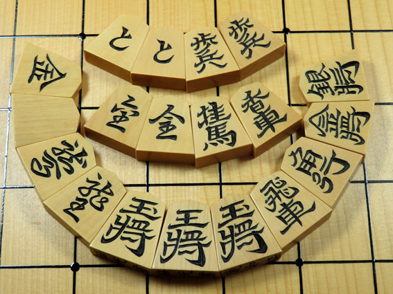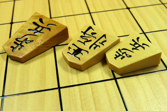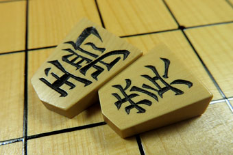左が通常の大きさの「歩兵」。右の「王将・歩兵」がミニ駒(通常の70%)。 |
