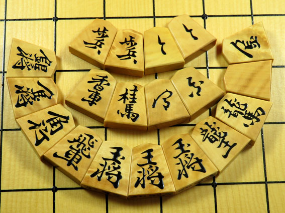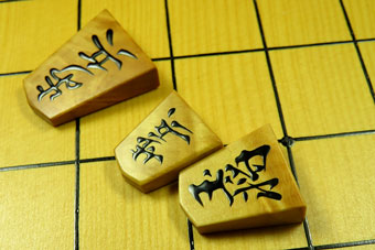 左が通常の大きさの「歩兵」。右の「王将・歩兵」がミニ駒(通常の70%)。 |