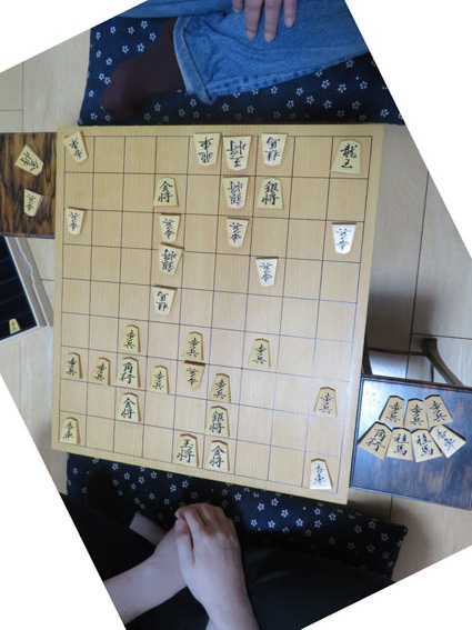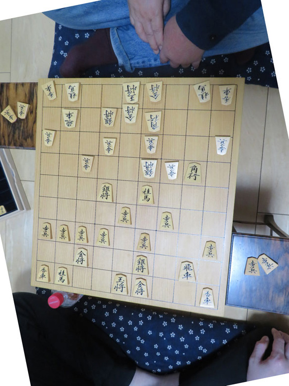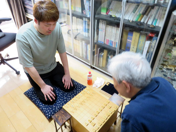 この「酔棋好」が完成し、小谷氏が取りにいらしたとき、魂入れの儀式としての記念対局は、下写真をご覧いただきたい。先手の小谷氏が急戦調将棋にし、後手の私(増山)がその対応に遅れ序盤からおもしろくない局面を迎えた。その対局は、小谷氏の圧勝に終わった。この新しい「酔棋好(花押)」は、「咸宜苑に飾られると思うので、お店に行った方はのぞいてみていただきたい。
